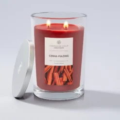 Create a warm and comforting retreat in your abode by lighting the Cinna-Mazing Glass Jar Candle from Home Scents by Chesapeake Bay Candle. Infused with the spicy and soothing fragrance of cinnamon, this scented glass jar candle evokes a dreamy and nostalgic ambiance in your living space to let you renew and refresh after a long day. Poured in a clear glass container with a golden lid, this scented jar candle looks stunning placed on your mantel, coffee table or end table and fills your abode with an alluring radiance and stimulating fragrances to set the mood for wonderful evenings.