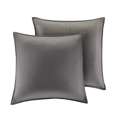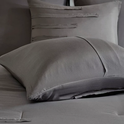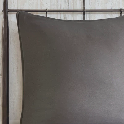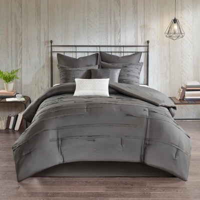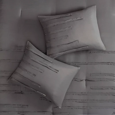 Bring a casual farmhouse look to your bedroom décor with the 510 Design Jenda 8 Piece Comforter Set. The dark grey comforter and shams feature raw edge ribbon detailing that add dimension and texture to the top of the bed. Matching solid grey Euro shams complement the casual bedding set, while decorative pillows with embroidery and pleated details provide elegant accents. A solid grey bed skirt completes the bedding set to give it a clean finish. Made from ultra-soft microfiber with hypoallergenic filling, this farmhouse comforter set is machine washable for easy care. The microfiber bedding set may come in rolled or compressed packing and will need to be fluffed up. Use a steam iron to help remove wrinkles easier.
