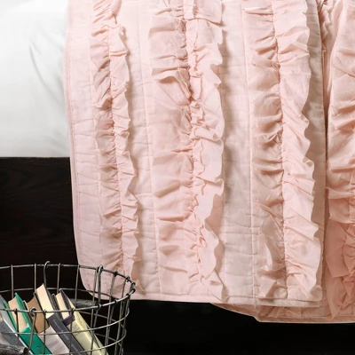 Lush DĂ©cor’s Belle Quilt Set is the essence of frilly and pretty. The layered ruffles create luxurious dimension as they cascade over the bed. The quilt itself is so soft to the hand you’ll just want to surround yourself with it and never get out of bed. Each delicate ruffled layer creates a three-dimensional look in your bedroom. It has a calming effect, perfect for supreme relaxation and deep sleep. This Belle Quilt Set will add a touch of elegance to your master bedroom or guest bedroom. It is even perfect for your daughter’s big girl bedroom makeover. The Belle Quilt 2pc Set Twin includes a soft cotton quilt and matching pillow sham. The Belle Quilt 3pc Set includes a soft cotton quilt and two matching pillow shams. It is available in both King and Full/Queen sizes. Due to the delicate nature of the ruffled embellishments, this Belle Quilt 2pc Set is not safe for machine washing and should be dry cleaned. Part of the Belle Collection.