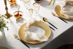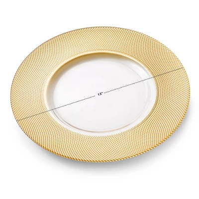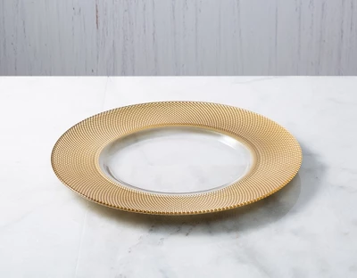 Dress up your table with these intricately designed chargers. They are dotted with minute gold beads as a thick border to accentuate the dish. Run your finger through the border of this dish to enjoy the kinesthetic feel it provides. Sold in a set of four. Easy wash and store.