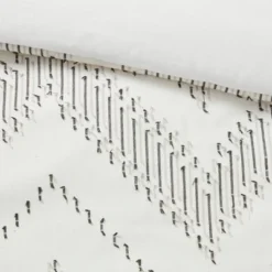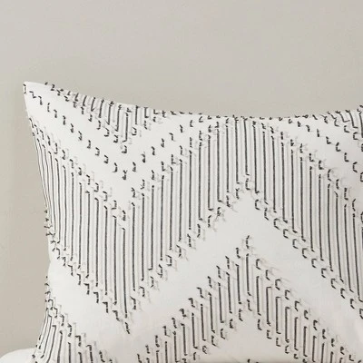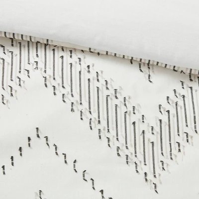 The Keaton 4 Piece Cotton Clip Jacquard Duvet Cover Set offers a contemporary update to your bedroom. This cotton duvet cover features a light base fabric with a contrasting clip jacquard chevron pattern, for a chic casual look. Matching cotton shams also showcase a chevron design to complement the duvet cover, while an oblong decorative pillow adds a charming finishing touch. This bedding set is also OEKO-TEX certified, meaning it does not contain any harmful substances or chemicals to ensure quality comfort. Machine washable for easy care, this chevron duvet cover set may come in rolled or compressed packing and will need to be fluffed up. Use a steam iron to help remove wrinkles easier. A button closure at the foot end secures a padded insert within the duvet cover and inside corner ties prevent it from shifting (insert is NOT included).