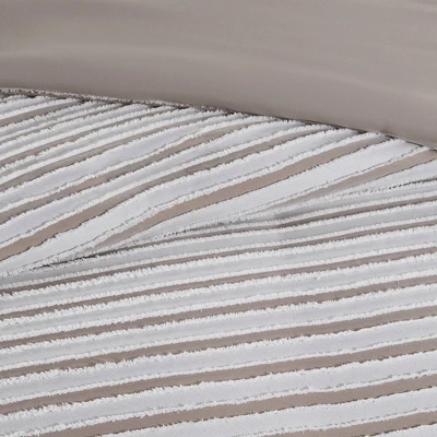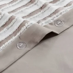 This Madison Park casual farmhouse style duvet cover set features a pieced clip jacquard pattern in a white and natural two-tone stripe effect. The duvet covers come with button closures and 4 inner ties to help keep your duvet insert secured (inserts sold separately). This machine washable bedding set is OEKO-TEX certified and features an antimicrobial treatment.