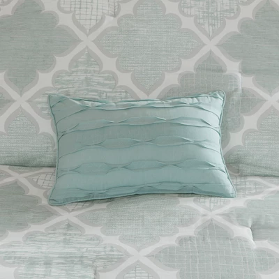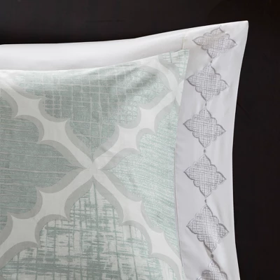 Freshen up your space with the modern style of the Sidnee 9 Piece Cotton Sateen Comforter Set. Flaunting a geometric print, in vivid hues, this comforter features printed metallic details with a solid reverse, for a contemporary appeal. Matching shams complement the comforter, while three decorative pillows with embroidery and fabric manipulation add charm and texture to the top of the bed. A solid bed skirt completes the look with a clean finish. Two pillowcases with geometric embroidery along the hems are also included. Made from cotton sateen, this bedding set is OEKO-TEX certified, meaning it does not contain any harmful substances or chemicals to ensure quality comfort and wellness. Items in the set may come in a rolled or compressed packaging, which will need to be fluffed up or steam ironed before use to remove wrinkles.